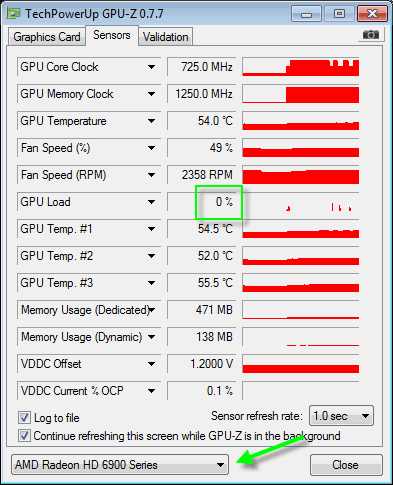 Так у Вас два процессора GPU на борту видекарты. Работают в режиме CrossFire. В выпадающем списке две строчки? Может нагрузка идет на второй видеопроцессор? Или просто некорректно отображается?