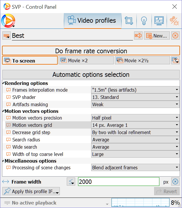 Sometimes when a video has been playing great for a certain amount of time, SVP seems to restart of it's own, so the image freezes for less than a second and then it reverts to normal with SVP reactivation and showing on screen information (like when I use the seekbar).