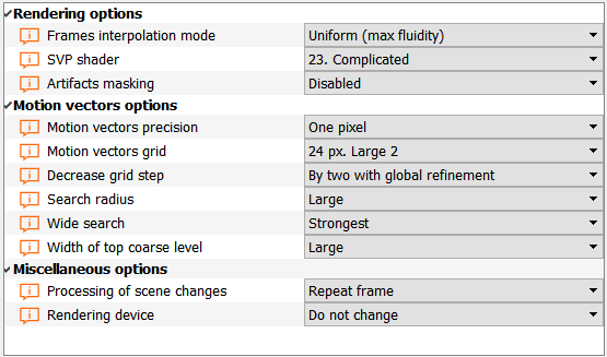 Other than that, there are only 3 other settings your really should worry about (everything else can just be "maxed out" unless you're having performance issues), but these settings do not directly effect the motion interpolation - they are Artifact masking, Decrease grid step, and Processing of scene changes.