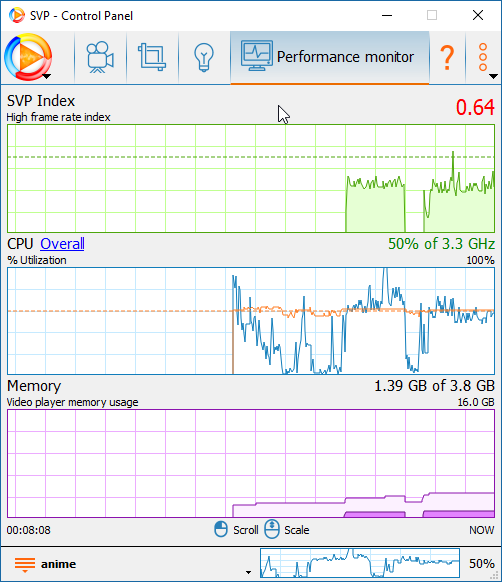 My SVP index never seems to exceed over 0.7 in 1080p videos and my CPU usage seems to cap at around 60% (screenshot 1). In 480p videos my SVP index goes to around 1.3-1.5 (screenshot 2).