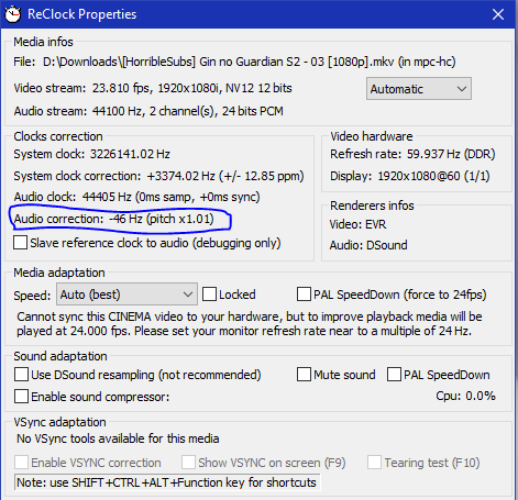 I suspect that my problem is somewhat related to ReClock, as i see the Audio correction with a minus sign when the problem occurs ( attached a picture).