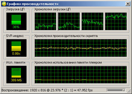 И еще заметил, что если процессор работает в среднем более 60-70%. Тогда и могут наверное у людей возникать всякие дополнительные артефакты, или пропадать плавность. Так как не все ядра одинаково загружены. Одни под 100 например, а другие 20-30%. То есть надо, чтобы был всегда некий запас по мощности, чтобы в сложные моменты плавность не пропадала и чтобы дополнительная нагрузка не способствовала повышению артефактов. Лучше держаться настроек в районе загрузки процессора 30-60% в среднем. И тогда не надо под каждое видео ничего подстраивать. И все работает уже стабильно. Как готовый продукт.