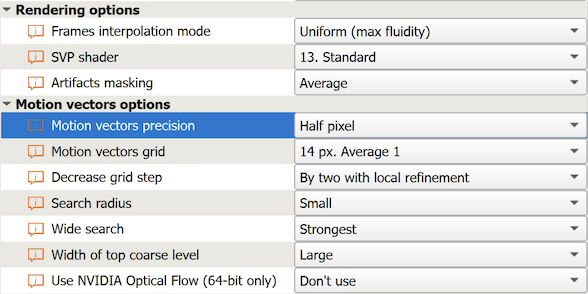 These are my current settings for running at 120fps. I am no longer overriding PEL for quarter pixel accuracy as half a pixel is enough. I've found that Average Artifacts masking with the Standard SVP shader is the best combination for removing even the more difficult fast motion vertical artifacts. The other settings are down to your GPU capabilities, but this is the smoothest and most artifact free results I've had using SVP. The remaining difficult to get rid of double images can be reduced fuirther by overriding the main search algorithm to use SATD instead of SAD. However the SVP manual says that it is Extremely slow and do not use it! plus it's not even listed when you select "All Settings". But it does work if you want to try it.
