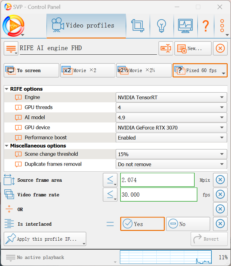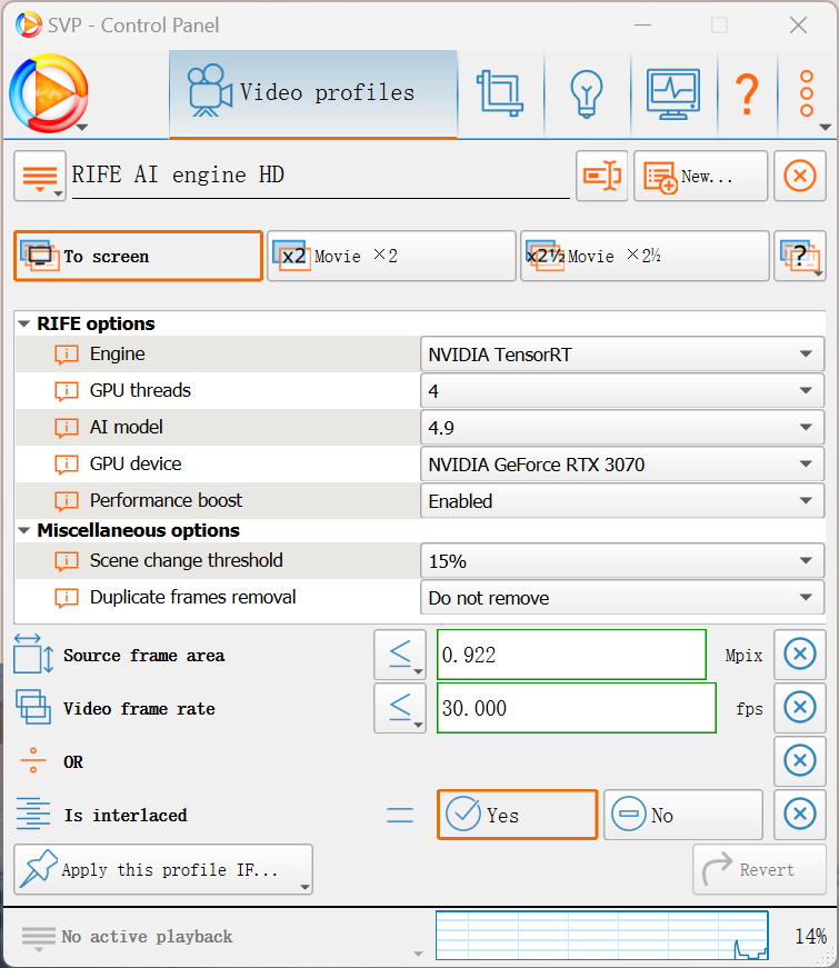 I have created profiles for HD, FHD and UHD based on the framerate and source frame area, and they are working fine. But today when I play an interlaced video, I notice it doesn't fall into the correct profile. If I play a 1080i video, whose frame size is 1440x1080, it should fall into the FHD profile but it goes to HD profile. Can someone please let me know how to change my conditions?