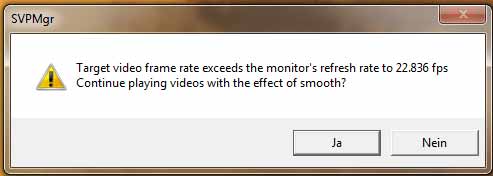 OK, I played around with 720p50 material from our german tv stations. without_svp.jpg shows a screenshot with SVP stopped. All frame rates (in decoder, in ffdshow and in the evr) are around 50fps (as they should be). gpu.jpg shows a screenshot with SVP (gpu mode) turned on. The decoder and ffdshow input frame rate is 50fps. The evr shows 60fps. So everything is fine here except for the video stuttering due to my slow machine. Now it becomes a bit more interesting. The screenshot cpu.jpg, which shows SVP without gpu-acceleration, proofes that the gpu-acceleration is generally working. Because without it you can see that even the decoder isn´t able to keep the frame rate at 50 fps. But could you please tell me why the frame rate of the evr goes wild? It oscillates between 40 and 120. The screenshot shows for example 118.66 fps. Shouldn´t it be limited to 60 which is the monitor refresh rate when SVP is configured with "To screen refresh rate"? This strange behaviour results by the way in a number of message boxes popping up (see msgbox.jpg).