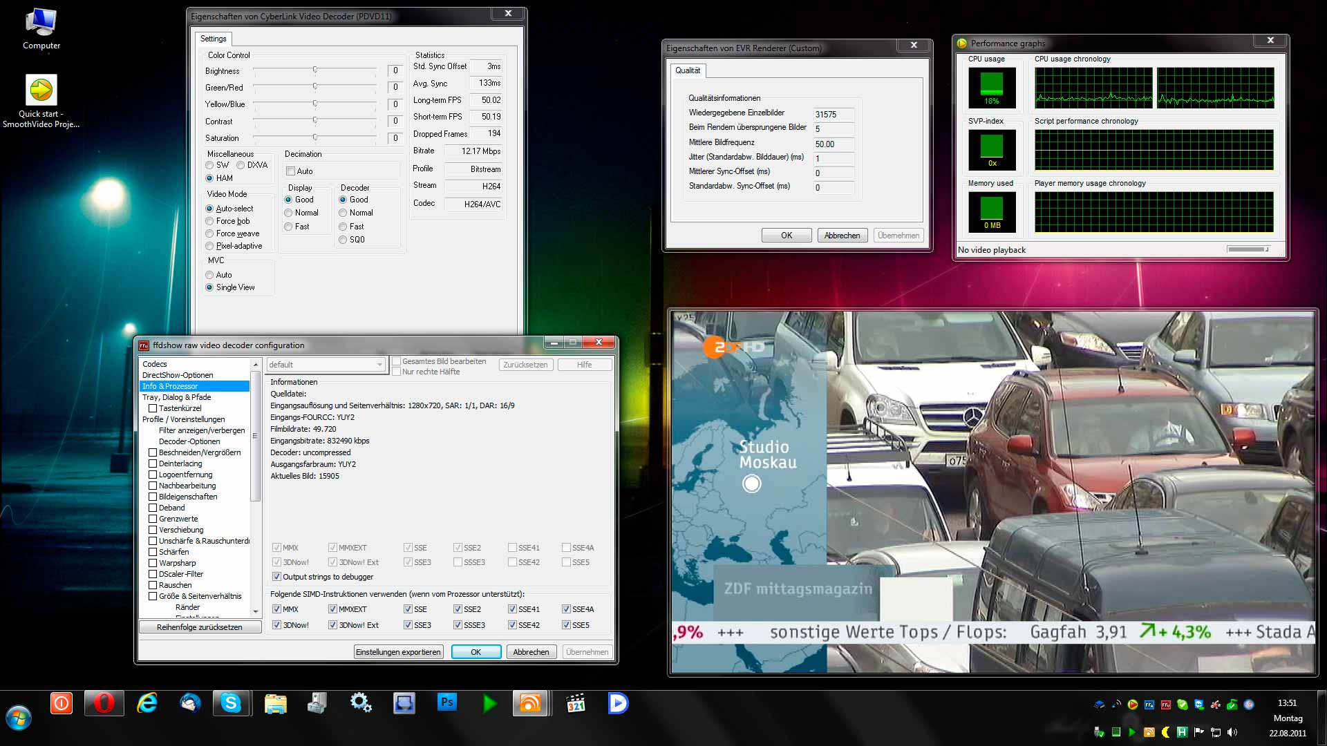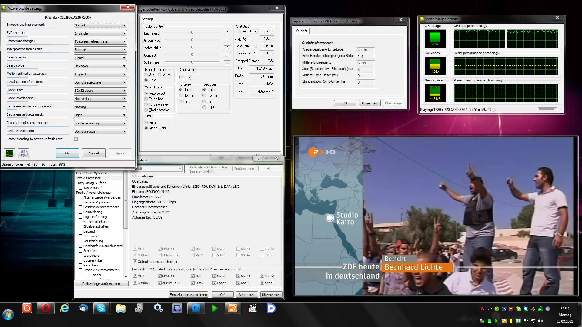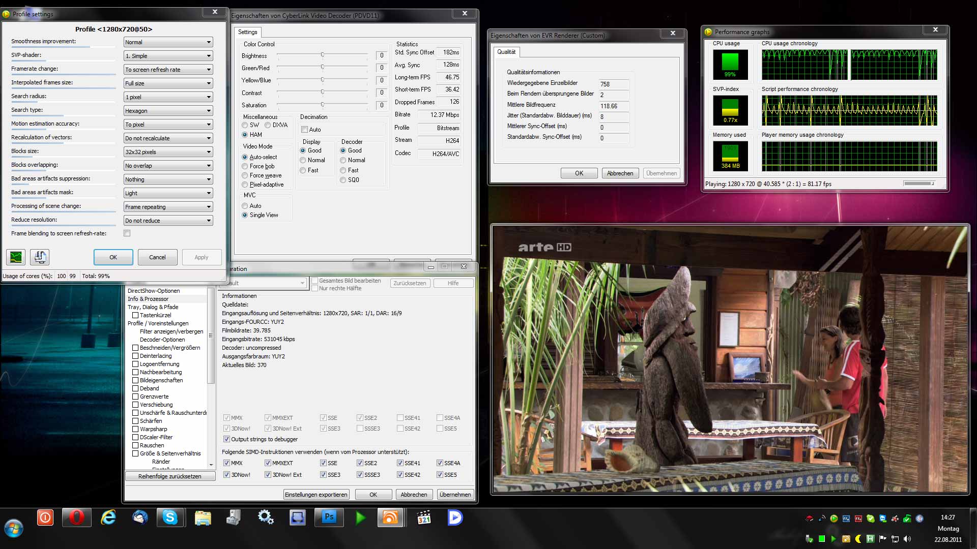 because my TV gives horrible results when doing motion interpolation, I´ve installed SVP 3.0.3 the big package) to let my pc do the job. It is an Athlon64 X2 3000 with an ATI 6670 (Catalyst driver 11.8). When SVP is turned on the cpu usage goes to 90-100% with the effect of a stuttering playback. So I tried the OpenCL option which surprisingly doesn´t improve anything. Suspecting that Nvidia´s CUDA is supported much better, I tried a GT430 as well. But with the Nvidia card the amount of stuttering is even higher.