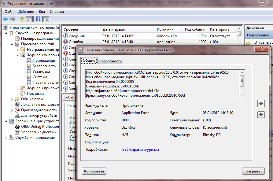 Теперь по тексту ошибки видно, что ошибка происходит в фильтре ffdShow. Код ошибки самый частый, и одновременно самый загадочный: 0xc0000005.