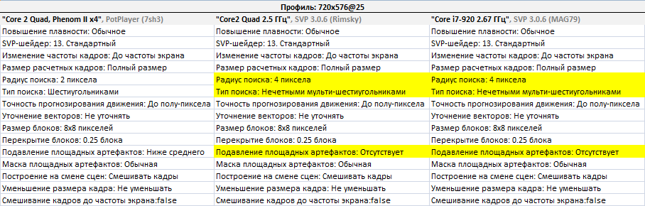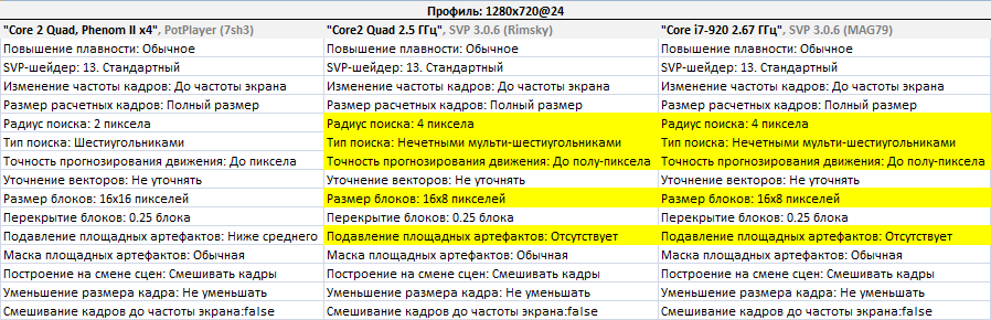 Желтым выделены значения настроек, которые отличаются. Пока без комментариев. По этим табличкам уже каждый пользователь сможет сам выставить интересующий его профиль в SVP.