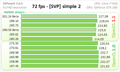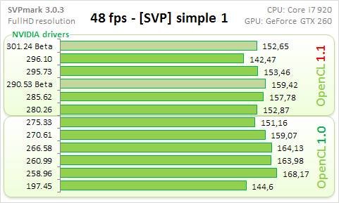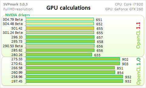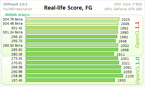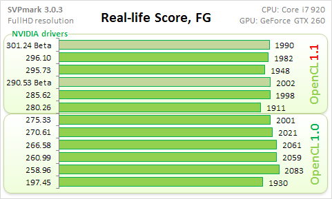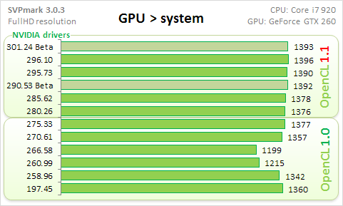 По сути получилось сравнение двух версий OpenCL (1.0 против 1.1) в реализации драверов NVIDIA. Начну с общего балла.