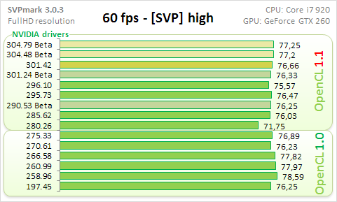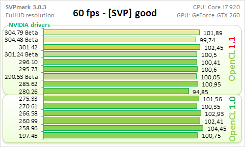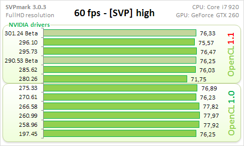 Наиболее близкие к стандартным настройкам SVP цифры отражают подтесты good, high и highest. Тут видно, что разница между результатами всех протестированных версий драйверов невелика и укладывается в 5%, если не считать недоделанный "тормознутый" драйвер 280.26.