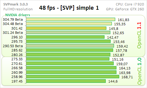 Сравнил скорость драйверов линеек R301 и R304 с имеющимися результатами. Есть прирост скорости на 2% относительно последнего протестированного драйвера 301.24 Beta. Лидер по скорости, драйвер 258.96 до сих пор непобежден. Он показывает 2105 SVPmark баллов, что на 4% лучше добавленных сегодня результатов (на диаграмме выделены желтым).