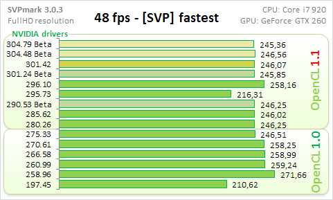 Очевидно по диаграммам, что интерполирование по одному кадру (подтесты 48 fps) выявляет наибольшую разницу скорости работы драйверов видеокарты. Разница в результатах составила 16-29%. Вот именно эти два подтеста и вывели драйвер 258.96 в лидеры.