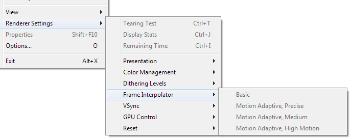 У меня включились пункты Frame Interpolator только на видеокарте nVidia GeForce GTX 260. Отрисовщик EVR Custom.