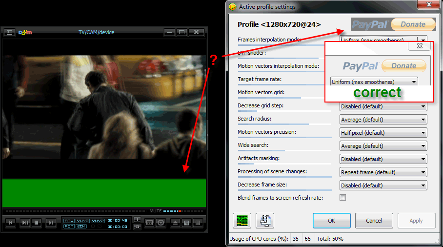The DVD film is playing (Bond - Casino Royal), goinig from a DVD Player via YUV into the capture card. Pot palyer is showing the film, SVP is reporing to work - but no motion interpolation.