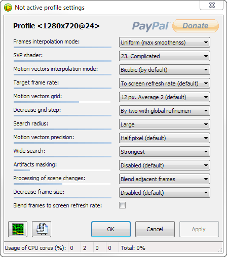 While playing 23.976 movies I just want to know which options to select to achieve maximum smothness even if this means dealing with artifacts. My TV supports maximum 60Hz so I will interpolate 23 to 60, that's for sure big_smile (just out of curiosity I read somewhere that human eye cannot tell the difference of videos above 60fps, but I guess some of you interpolate to 100 or 120Hz screens, do you see any difference by doing that?)