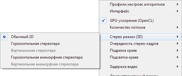 Для кадров обычного формата круг переключений сокращается до: Обычный 2D > Горизонтальная анаморфная стереопара > Вертикальная анаморфная стереопара.