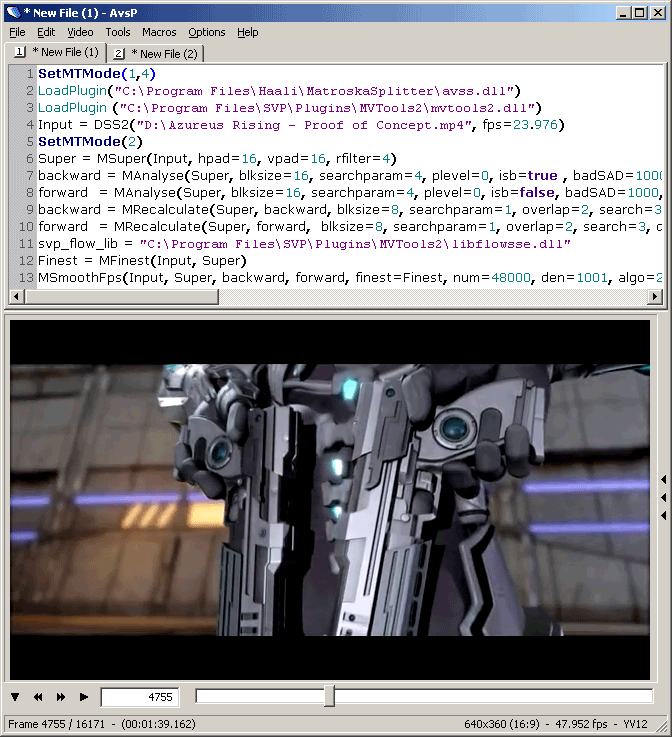 MSmoothFps(Input, Super, backward, forward, finest=Finest, num=48000, den=1001, algo=23, ml=0, sadml=150, sadgamma=2, block=false, blend=true)GPU: