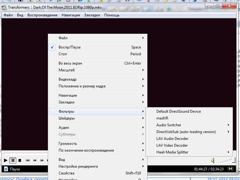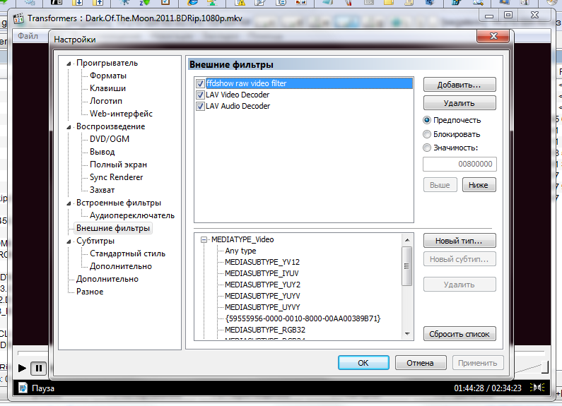 1. в списке внешних фильтров МРС первым должен быть ЛАВ видео декодер, вторым - ффд