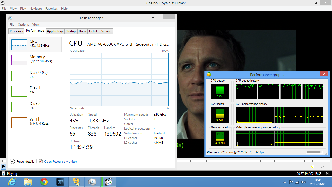 I have a strange occurrence, the Task Manager show my CPU usage ~50% of the value SVP Performance graphs show like you can see in the attachment image. The performance feels pretty bad i have set the settings to the default for AMD A8 APU, level 3, and as you see CPU is in 90-100% usage and SVP index 0.78. Feels like there is something wrong with SVP I do more trust Task Manager?