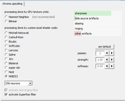 chroma upscaling: Lanczos 4 taps, Anti-ringing, SuperRes(passes2, strength 1.00, softness 0.00)