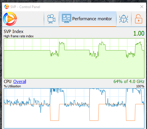that from 5 to 5 minutes the gpu usage comes to 0% for 1 second (but the video wont freeze), and then svp index becomes low, cpu usage maximizes and fps comes to near 10 fps...