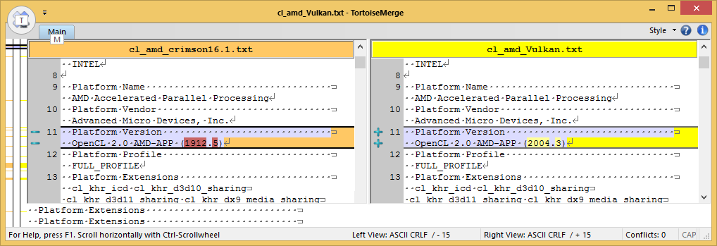 Сравнил в Win8.1 на видеокарте AMD Radeon R9 850. В драйверах Vulkan по сравнению с Crimson 16.1 отсутствует расширение cl_ext_atomic_counters_32, добавлено расширениеcl_amd_fp16.