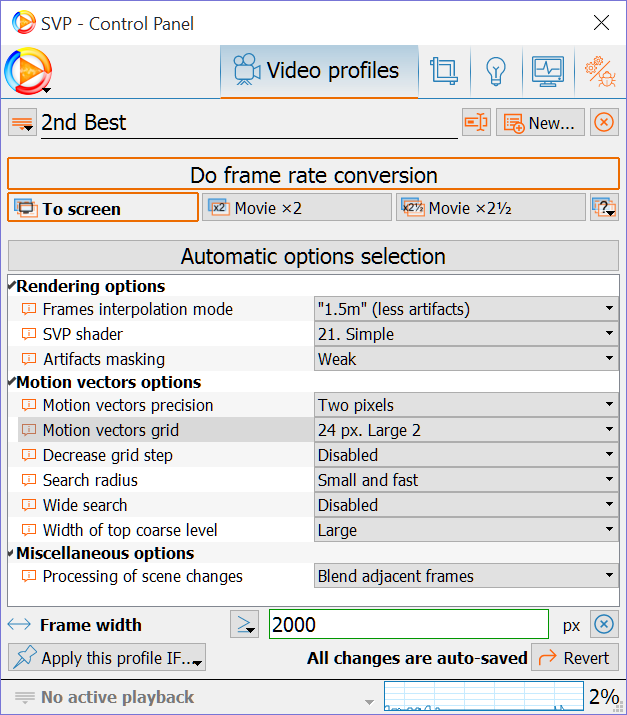 Sometimes when a video has been playing great for a certain amount of time, SVP seems to restart of it's own, so the image freezes for less than a second and then it reverts to normal with SVP reactivation and showing on screen information (like when I use the seekbar).