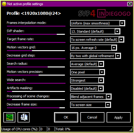 EDIT: Ok, so first off I need to establish a base-line. For the following 1080p SVP settings, can you tell me how the CPU performance is for film-like content and how the artifacting is for anime content?