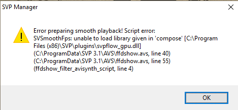 SVSmoothFps: unable to load library given in 'compose' [C:\Program Files (x86)\SVP\plugins\svpflow_gpu.dll]