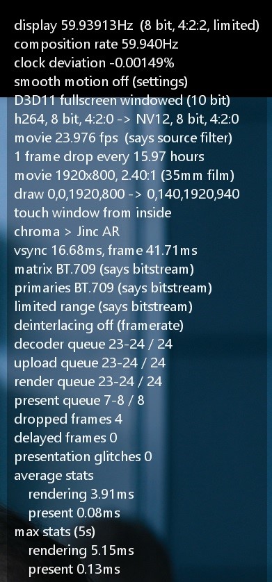 „fullscreen exclusive mode” ON is necessary if you see dropped frames or jumps while playback to eliminate them.