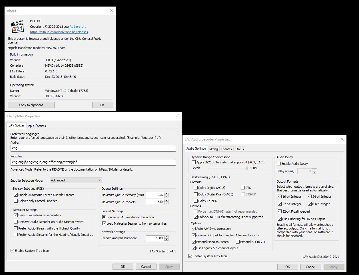 Properties for internal filters in MPC HC and MPC HC x64 tell me it's 73.1 version of LAV, so I know it's not using those since the LAV Spliiter instances say it's 0.74.1. Win10x64, Xonar DGX.