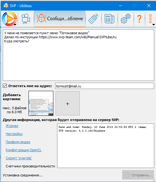 SmoothVideo Project → Эксплуатация SVP → Не завершается отправка отчета о проблеме из программы SVP