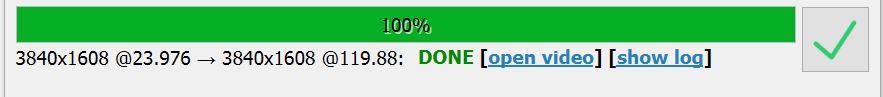 Hi there, i try to transcode a 4k 23.997 fps video to 120hz, i have all settings saying it is 120fps (profile already set accordingly, and under profile it already shows: 3840x1608@ 23.976 -> 3840x1608@119.88.