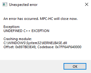 3) успевают воспроизвестись несколько кадров (<1 секунды), звук некоторое время воспроизводится, потом останавливается и он, плеер зависает, сразу после зависания вылетает ошибка (скрин прилагается, вторая ошибка была лишь раз), жмакаешь ок - процесс не висит