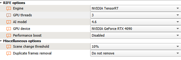 Title: TensortRT; Script name: rife_trt; Other values by default - "FRC profile", "ON or OFF"