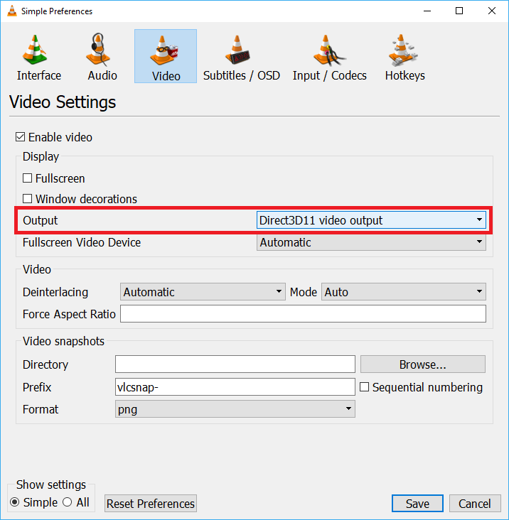 меню Tools > Preferences > Video > Output