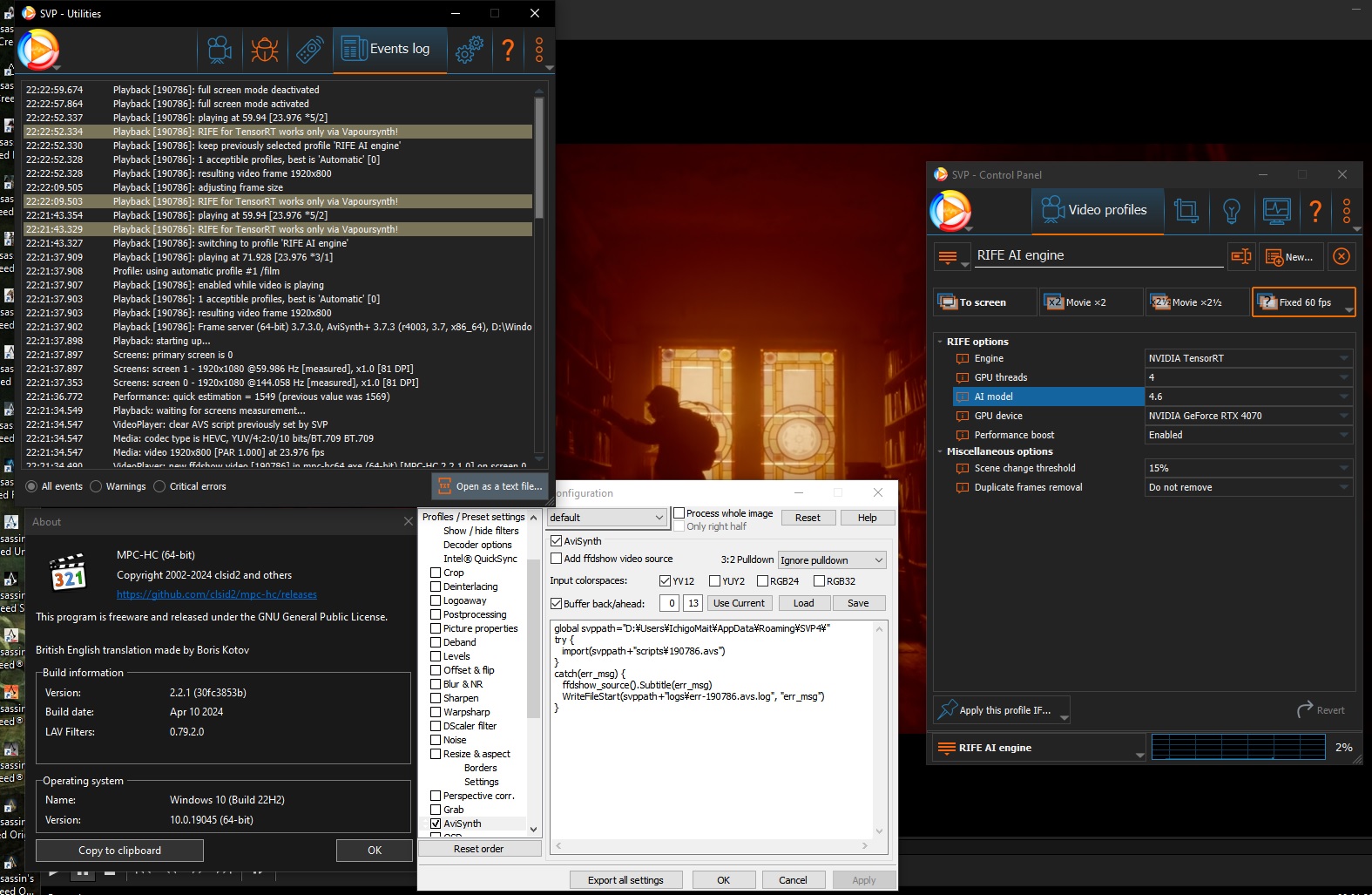 So I'm just gonna stick with rife ai engine profile and avisynth filter, I get a better result than trying to use automatic or whatever custom combination of settings. (using rtx 4070, MPC-HC x64 2.2.1 with lav filters and ffdshow and latest AviSynthPlus_3.7.3_20230715), the only caveat being that it doesn't switch to rife ai engine profile, have to do it manually, but who cares at least it works better than non rife ai engine profile.