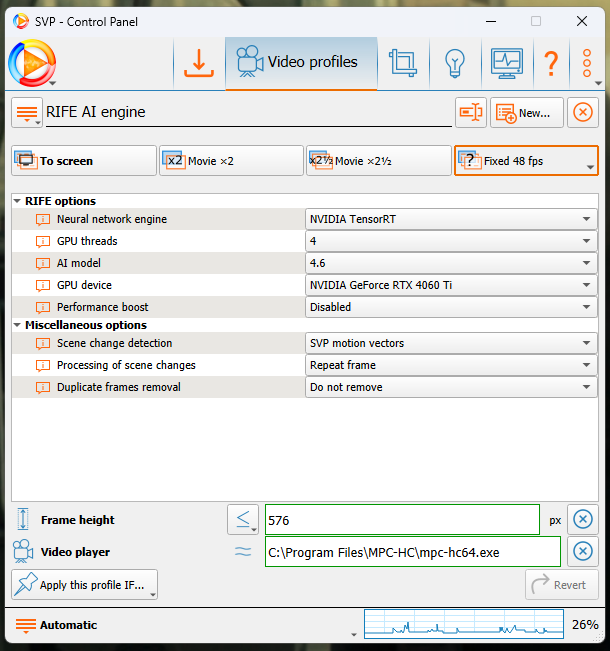 Im using Rife AI engine with MPC HC, it works perfectly, but i cant set it to use automatically.