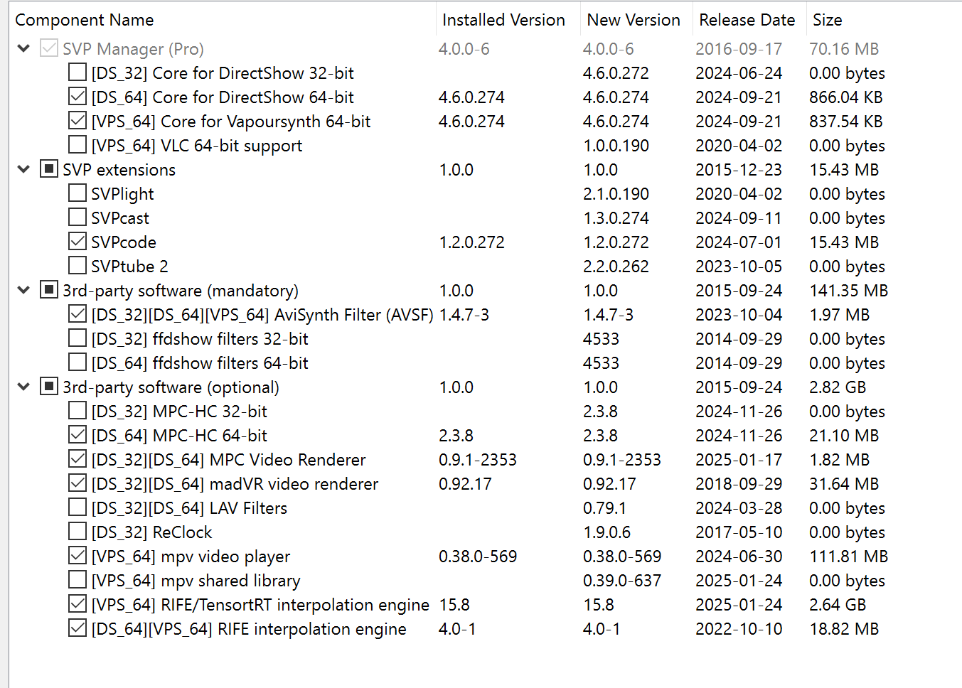 I am on Windows 10 22H2 with the latest nVIDIA Drivers, I have attached an image of the SVP components that I have installed