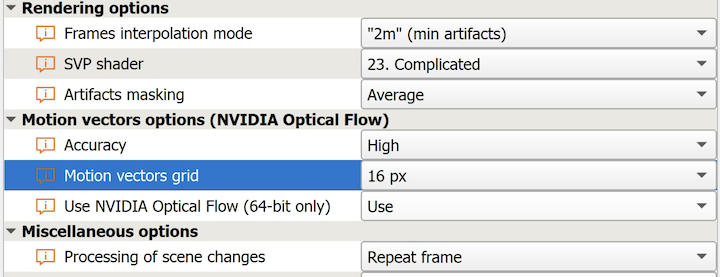 Has the SVP algorithm been improved since RIFE came out? I ask because the basic Automatic Profile with the slider on "Higher Quality" is actually a great starting point. RIFE motion looks a bit more "fluid" but at the cost of some very nasty artifacts. With a little tweaking of SVP Pro, it is possible to get practically artifact free smooth motion with very little GPU resource, especially if you have an good Nvidia GPU. I'm glad I've upgraded but there was really no need. More importantly, I feel a little like I wasted a lot of time trying to reduce RIFE artifacts when I could have just been using SVP by itself.