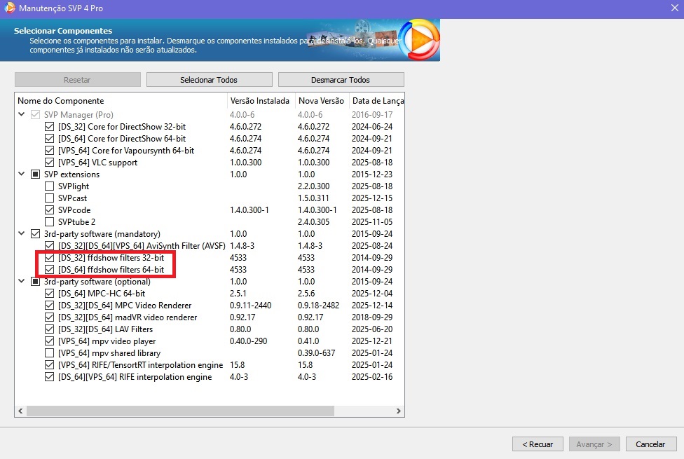 I used the "Updates and features" tool in SVP and added the ffdshow filters as in the image below. Could this be interfering with something?