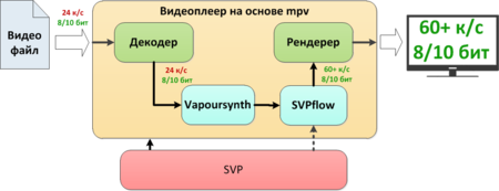 mpv и все основанные на нем проигрыватели: используя интерфейс Vapoursynth, загружает модуль SVP