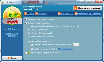 SVPmark - тест производительности системы при работе с пакетом SmoothVideo Project (SVP), использующий для теста реальные алгоритмы и параметры, применяющиеся в SVP 3.0.